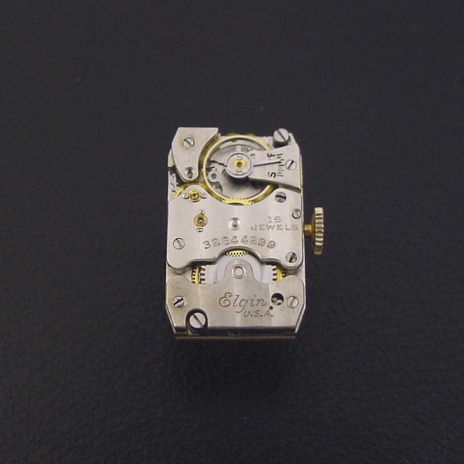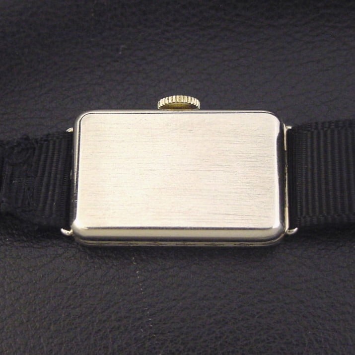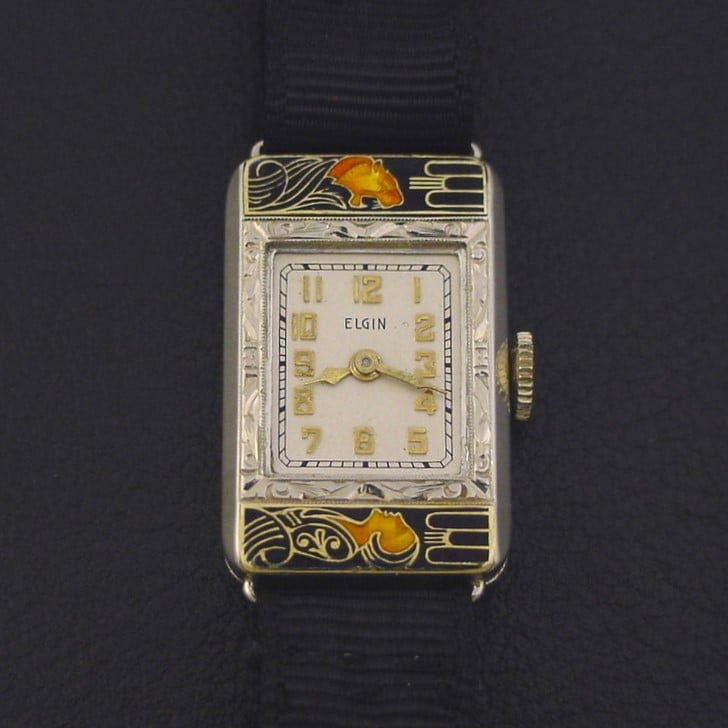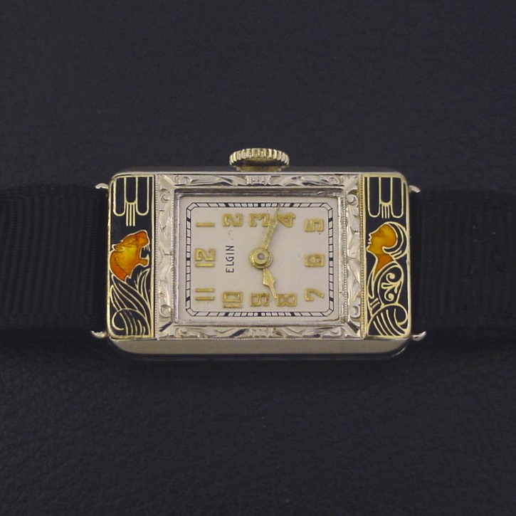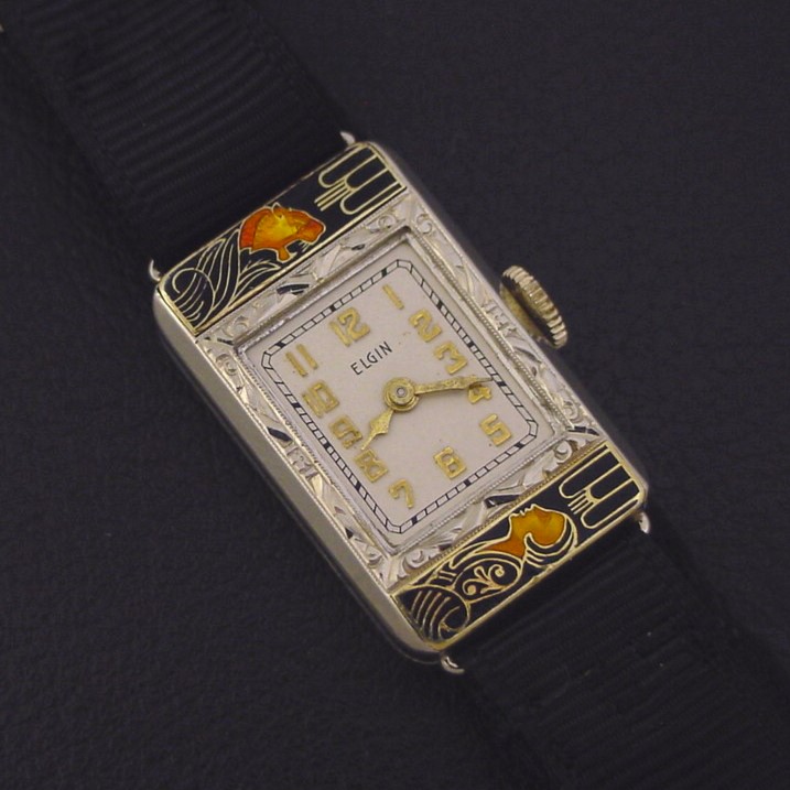 In the 1920s, no other watch manufacturer could match Elgin’s Art Deco designs for ladies’ wristwatches. Elgin retained top designers of international prominence to create some fantastic designs. The “Lady and Tiger” is perhaps the most famous and sought-after of the enamel watches from this period and features a 1920s flapper girl on one side and a roaring tiger on the other. It was priced to consumers at $65.00 in 1928. This example is in crisp, near mint showing almost no. Enamel is superb and complete. Hinged caseback is superb, with most of its original factory-applied brushed finish. The case measures 30mm long and 17mm wide. Original dial is superb, has gold embossed numerals. Has new glass crystal. This watch is powered by its correct 15-jewel Elgin grade 484 manual wind movement, just serviced and running strong. Has period silk grosgrain strap and white gold-filled clasp.