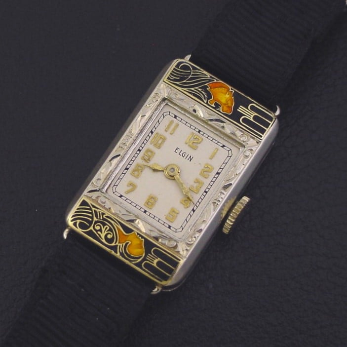 Scarce Elgin “Lady and Tiger” ladies’ Art Deco design wristwatch in solid 14K white and green gold with black and amber enamel, circa 1928.