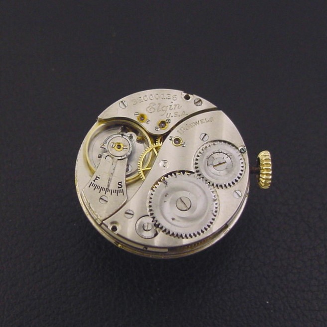 The “States 670” is an updated version of the earlier "Model E-9" watch and has an Art Deco geometric patterned bezel. It was only catalogued in white gold fill and this is only the second example I have ever seen in green. This example is in very good condition with some brassing to the lugs. Caseback is excellent and unengraved. Case measures 36mm long and 27mm wide. Original dial is very good. Has new glass crystal. The watch is powered by its correct 15-jewel Elgin grade 428 manual wind movement, just serviced and running strong.