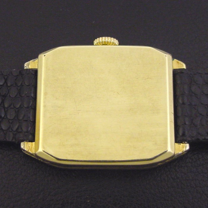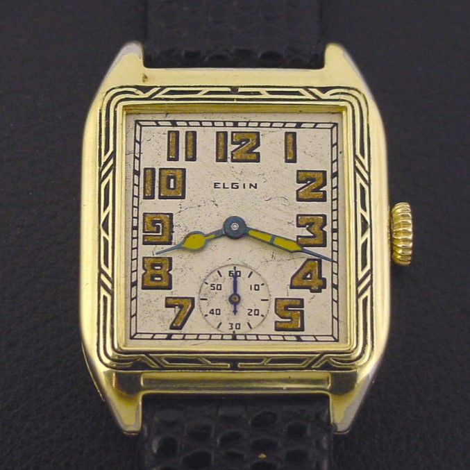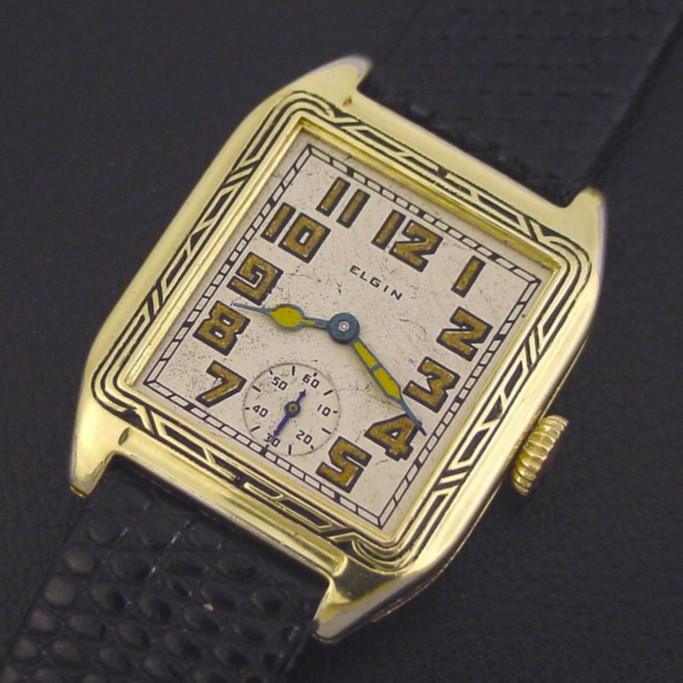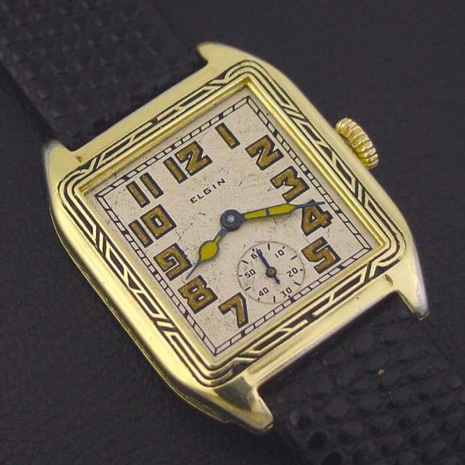 Rare Elgin “States 670” men’s Art Deco design wristwatch in 14K green gold fill, circa 1930.