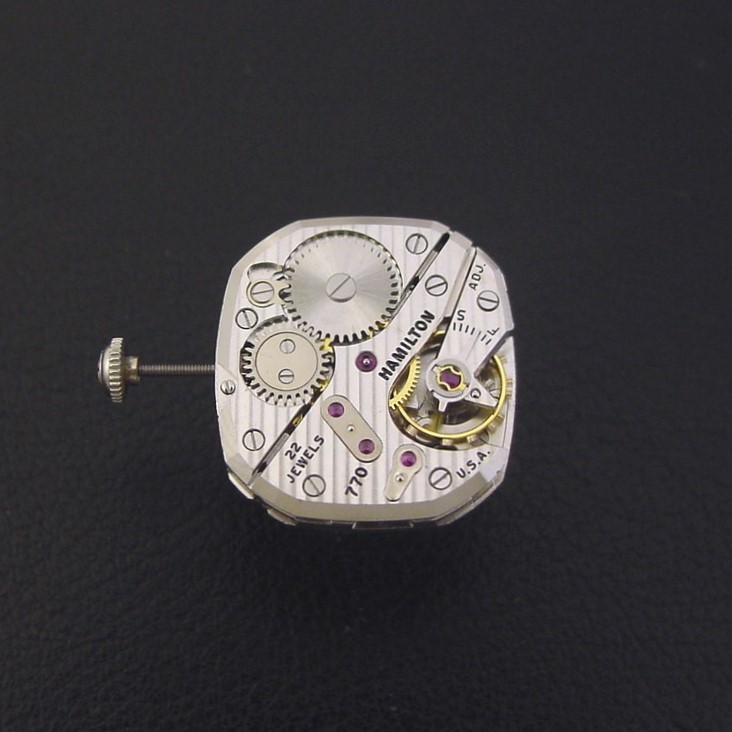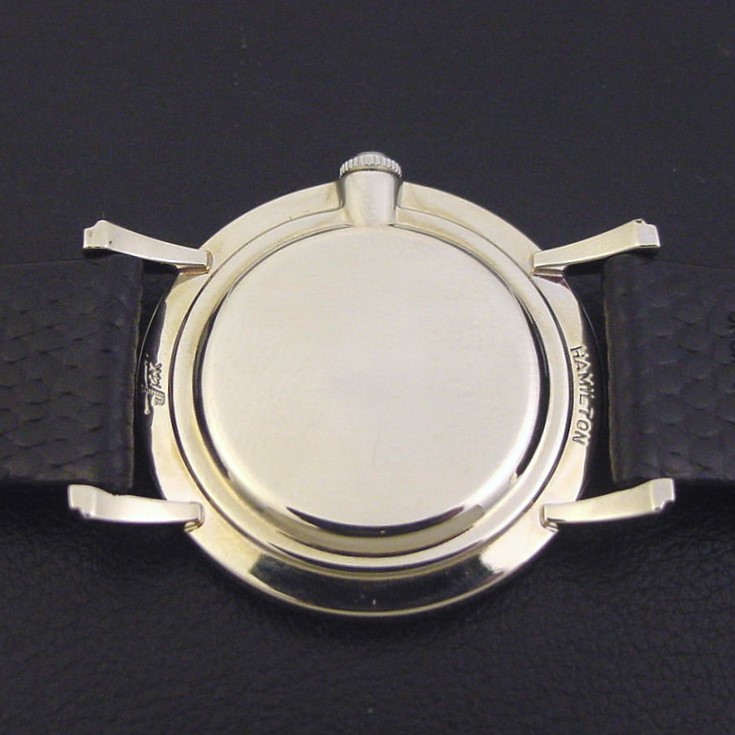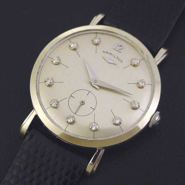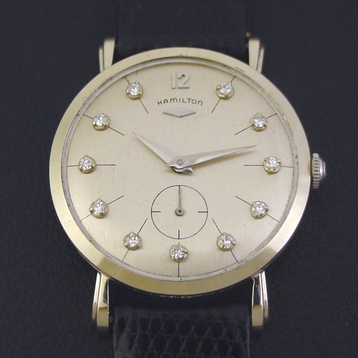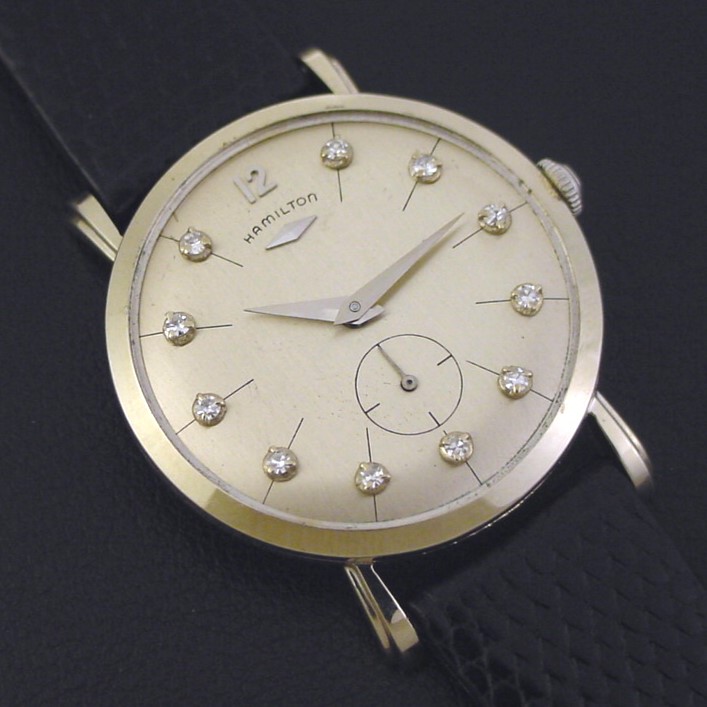 Although the standard “Bradford” model isn’t hard to find, it is quite rare in white gold with a factory diamond dial. Hamilton offered diamond dials on a select few of its high-end gold and platinum models in the late 1950s. The "Bradford" was priced at $300.00 with the diamond dial, twice as expensive as the standard "Bradford" with the regular dial. This is the only the second example I have ever offered. This example is in excellent condition showing only very light wear. Edges of the stepped lugs are distinct. Caseback is excellent and unengraved. The case measures approximately 40mm long and 33mm wide. Original dial is superb, has 11 factory-set high-quality diamonds. Has new acrylic crystal. The watch is powered by its correct 22-jewel Hamilton grade 770 manual wind movement, just serviced and running strong