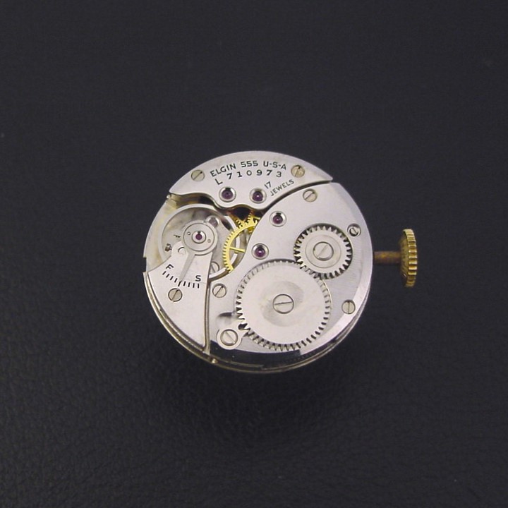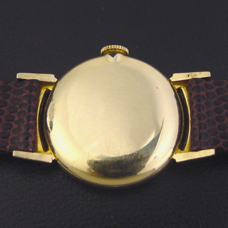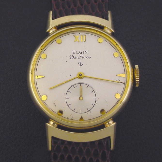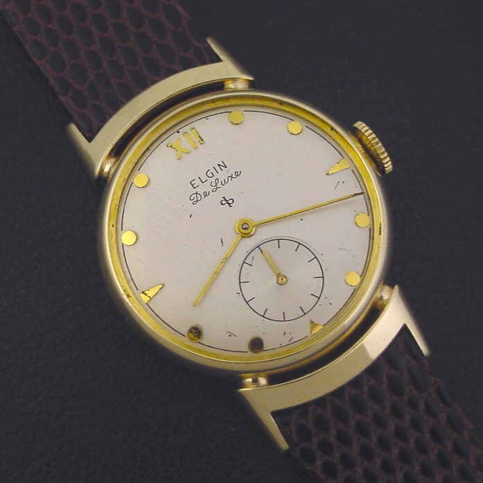 The "DeLuxe 5710" has a round case with semi-detached lugs. This example is in excellent condition showing only a few specks of brassing to the tips of the lugs. Caseback is excellent and unengraved, with a touch of wear underneath the crown. Case measures 41mm long and 30mm wide. Dial is excellent, with some light marks. Has gold embossed numerals and markers. Has new acrylic crystal. The watch is powered by its correct Elgin 17-jewel grade 555 manual wind movement, just serviced and running strong.