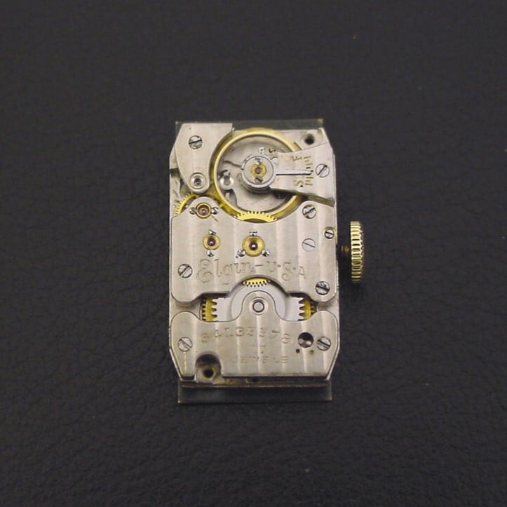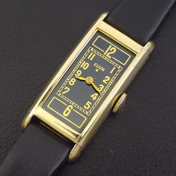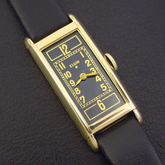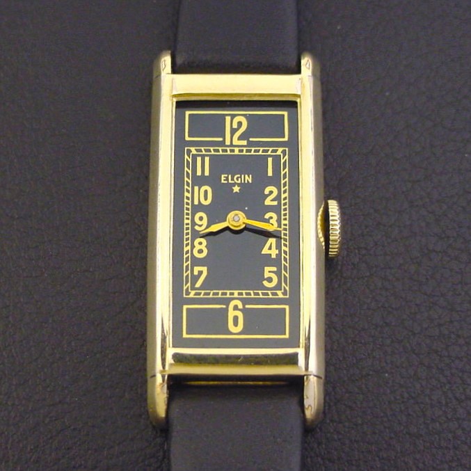 The "Model 2239" has a very narrow case and was priced at $47.50 in 1937. It is quite scarce with the black gilt dial. This example is in excellent condition showing only a few specks of brassing to the bezel and lugs. Caseback is excellent and unengraved. Case measures 39mm long and 17mm wide. Original black nickel finish gilt dial is excellent, with some light scratches. Has new glass crystal. The watch is powered by its correct 17-jewel Elgin grade 483 manual wind movement, just serviced and running strong.