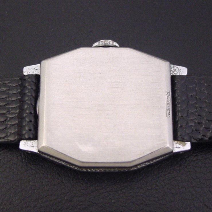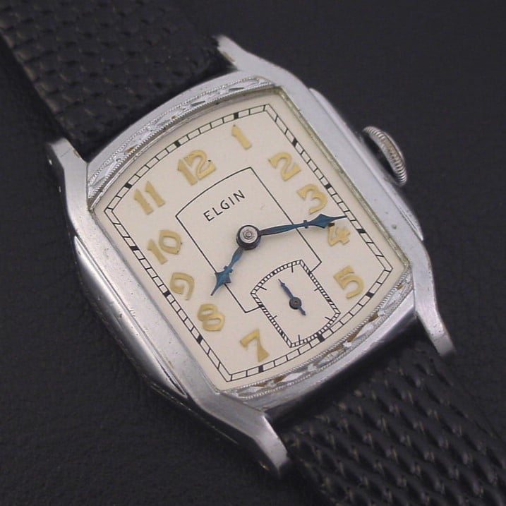 Uncommon Elgin "Model 2412" men's Art Deco design wristwatch in chrome and steel, circa 1937.