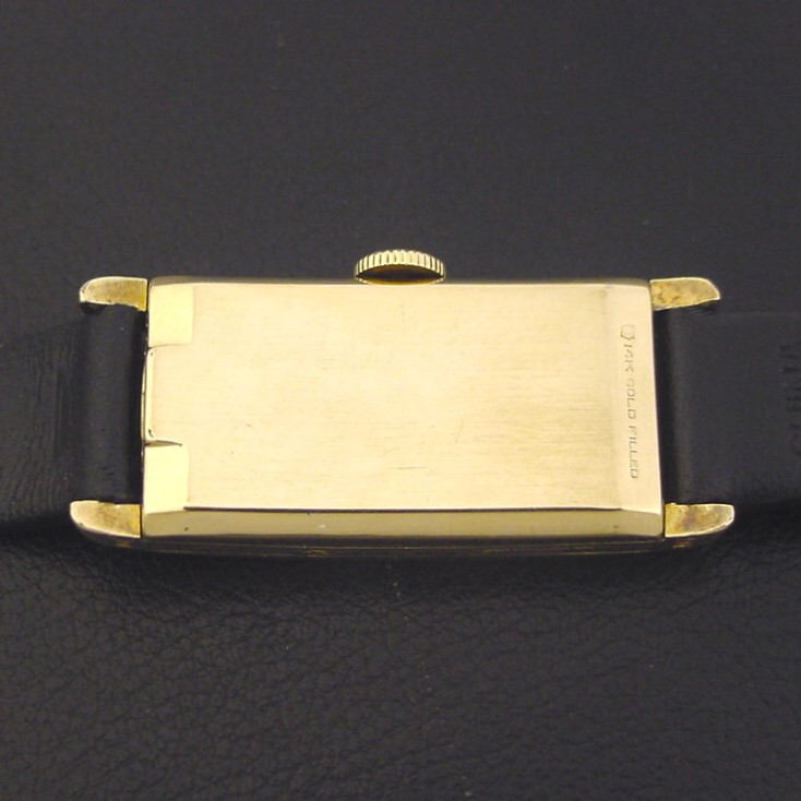 Scarce Elgin "Model 2239" men's Streamline Moderne design wristwatch in 14K yellow gold fill, circa 1937.