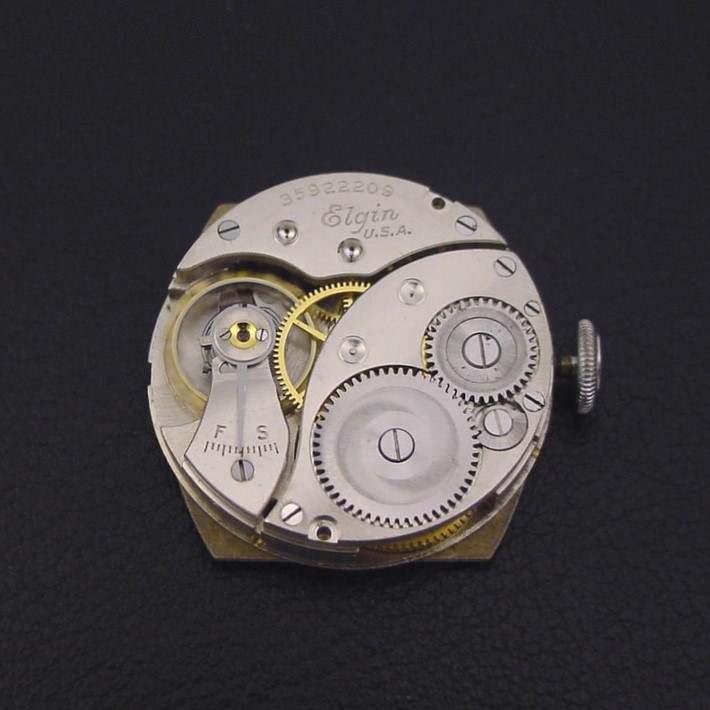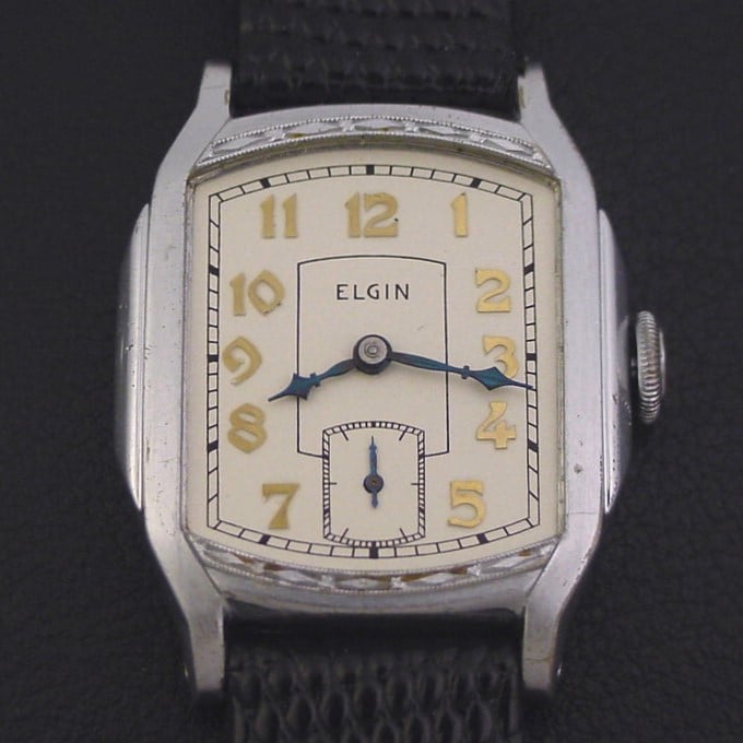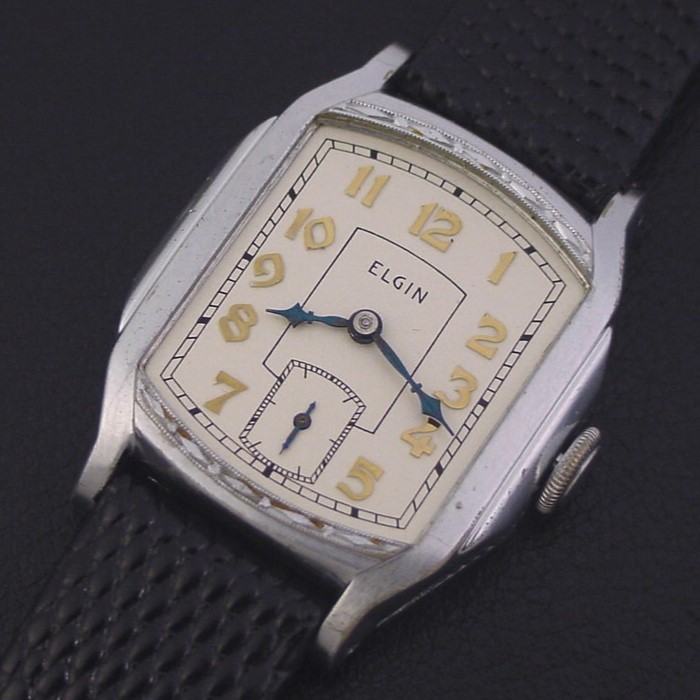 The "Model 2412" was in the very last group of Elgin wristwatches offered with the 4/0-size movement. It was priced at $17.50 in 1937. This example is in crisp, excellent condition showing all of its factory-applied brushed and polished finishes. Steel caseback is excellent and unengraved, with some very faint dings. Case measures 38mm long and 29mm wide. Original dial is superb, has gold embossed numerals. Glass crystal is superb. The watch is powered by its correct 7-jewel Elgin grade 485 manual wind movement, just serviced and running strong.