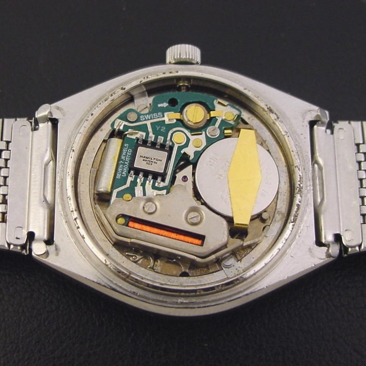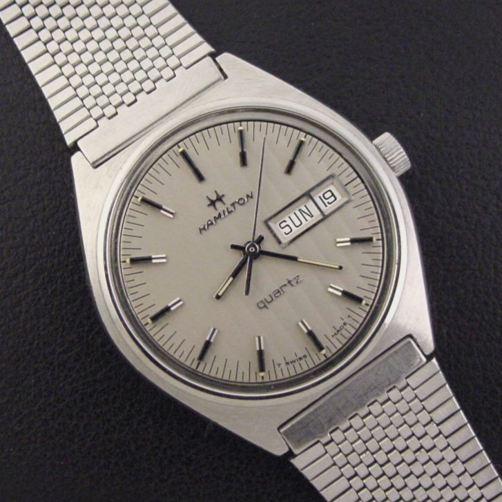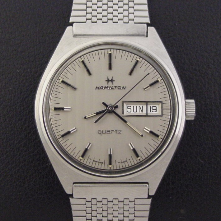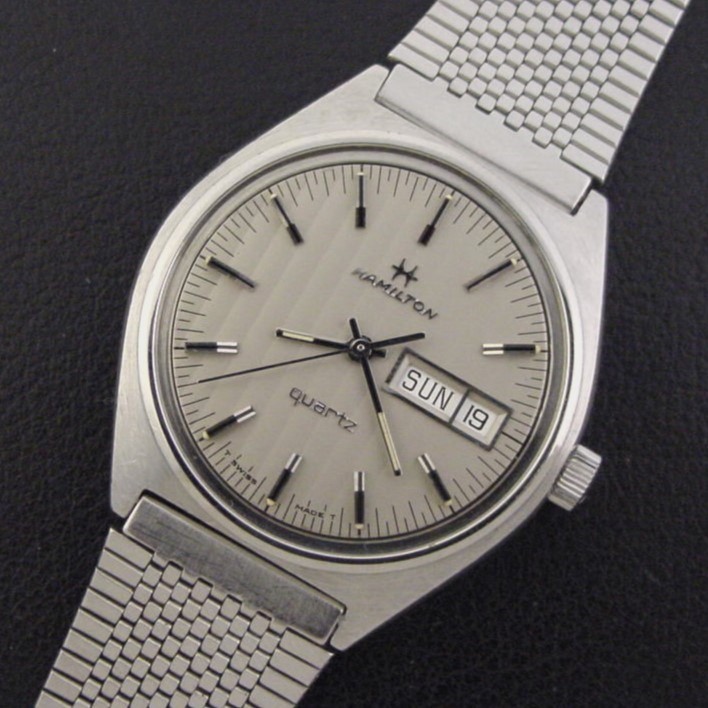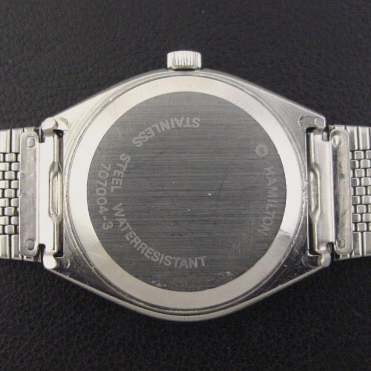 This model has a C-shaped case and a fantastic tapestry pattern dial. It was priced at $190.00 in 1977. This example is in excellent condition showing light wear and marks to the stainless steel case. Caseback is excellent and unengraved. The case measures 41mm long and 36mm wide. Acrylic crystal is excellent. Original tapestry pattern dial is superb. The watch is powered by its correct 7-jewel Swiss Hamilton grade 707 quartz movement, running strong with a new battery. Correct Hamilton stainless steel adjustable mesh bracelet is excellent.