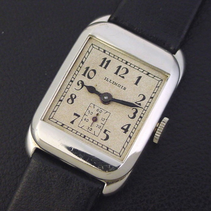The "Wentworth" was introduced in 1933 and discontinued that very same year... one of the very last Illinois men's wristwatch models and well into Hamilton's ownership of the Illinois company. It is a rare model and this is only the second example I have offered in 25 years. It was priced at $50.00 in 1933. This example is in excellent condition with only a few specks of brassing to the bezel corners. Caseback is excellent, with a monogram and a few tiny dings. Case measures 36mm long and 24mm wide. Original sparkle finish dial is excellent. Has new glass crystal. The watch is powered by its correct 17-jewel Illinois grade 207 manual wind movement, just serviced and running strong.