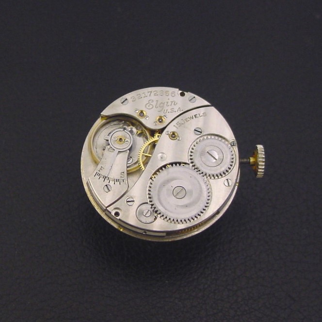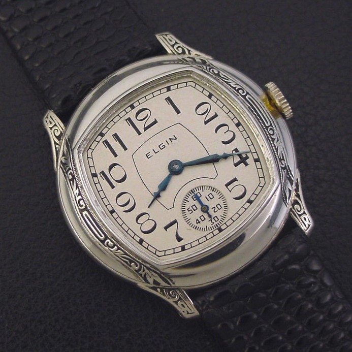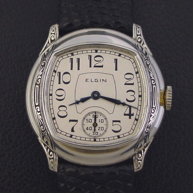 This uncatalogued variety of the “Model E-7” has a cushion-shaped dial and bezel rather than the round dial and bezel usually seen with this model. This is one of only a few I’ve had of this cushion-dialed version; it is quite rare. Elgin likely assigned a different model number based on the different dial and bezel, but Elgin researchers have yet to determine its true name from any currently known Elgin documentation. This example is in excellent condition with no brassing. Caseback is excellent and unengraved. Case measures 33mm long and 30mm wide. Original dial is superb. Has new glass crystal. Watch is powered by its correct 15-jewel Elgin grade 428 manual wind movement, just serviced and running strong.