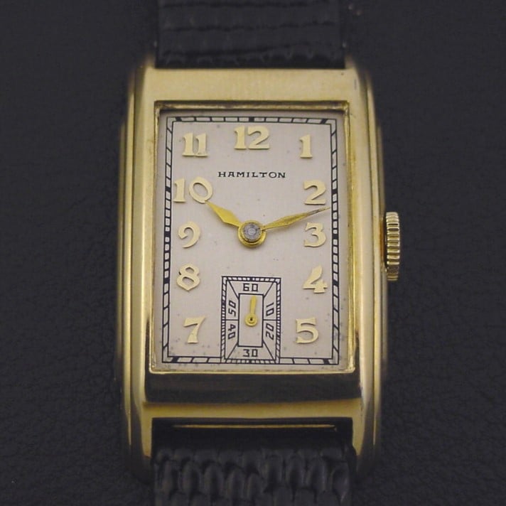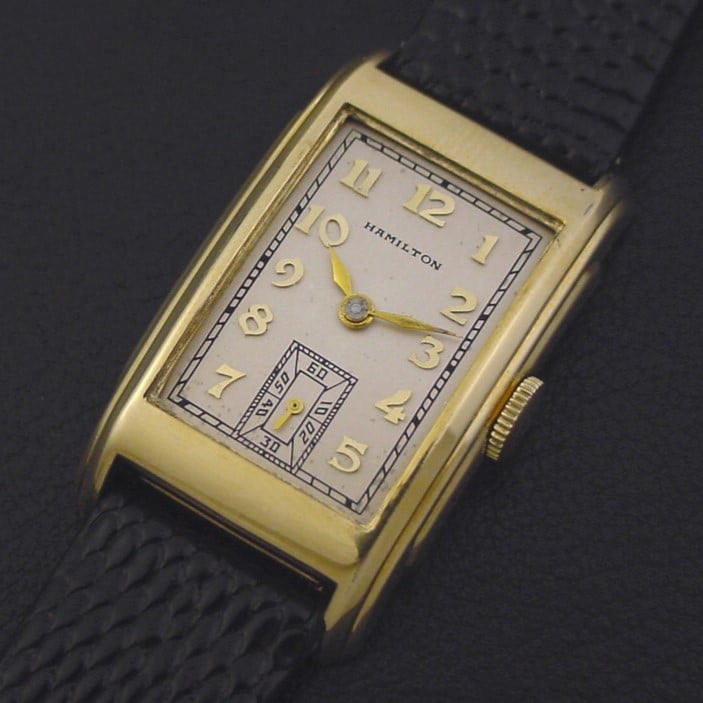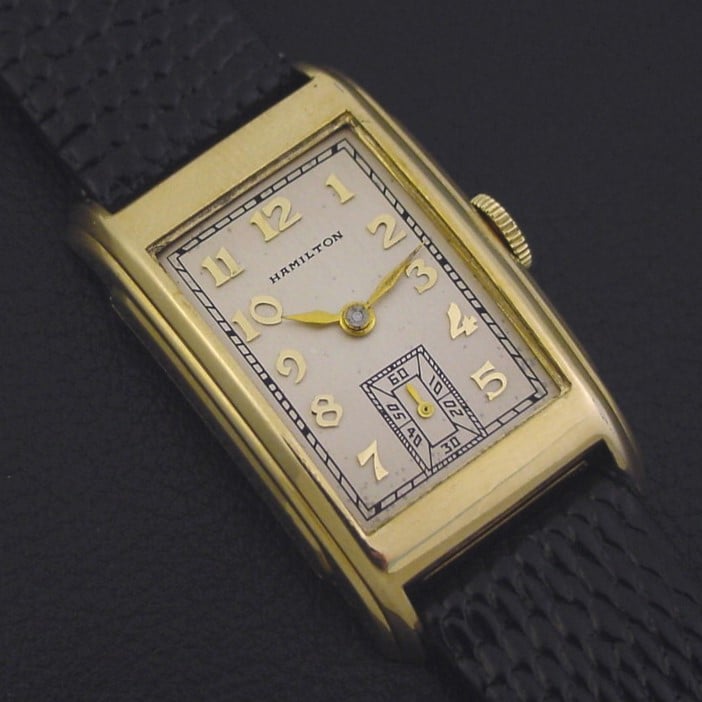 Scarce Hamilton “Whitman” men’s Art Deco design wristwatch in 10K yellow gold fill, circa 1940.