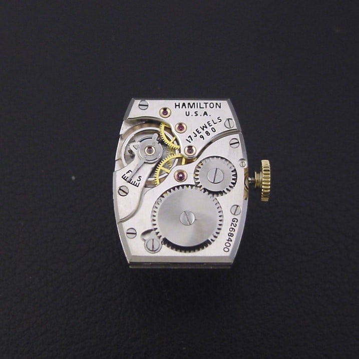 The “Whitman” was offered only in the 1940 catalog, priced at $45.00. The 1941 catalog included an insert noting that the watch had been discontinued. It is in excellent condition with only a couple of tiny specks of brassing. Caseback is excellent and unengraved, with a few tiny specks of wear in the corners. The case measures 38mm long and 22mm wide. Original inlaid enamel dial is excellent, has solid 18K gold applied numerals. Has new glass crystal. Watch is powered by its correct 17-jewel Hamilton grade 980 manual wind movement, just serviced and running strong.