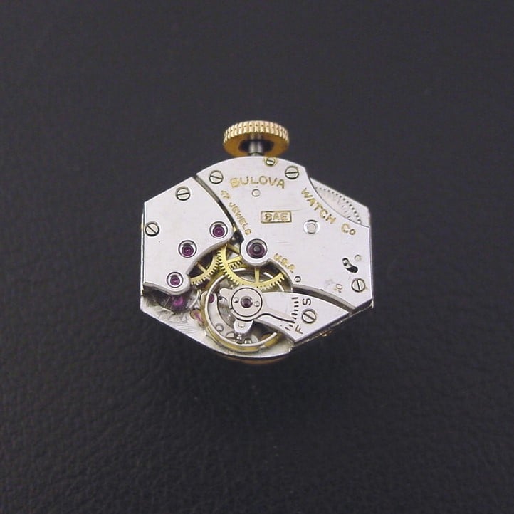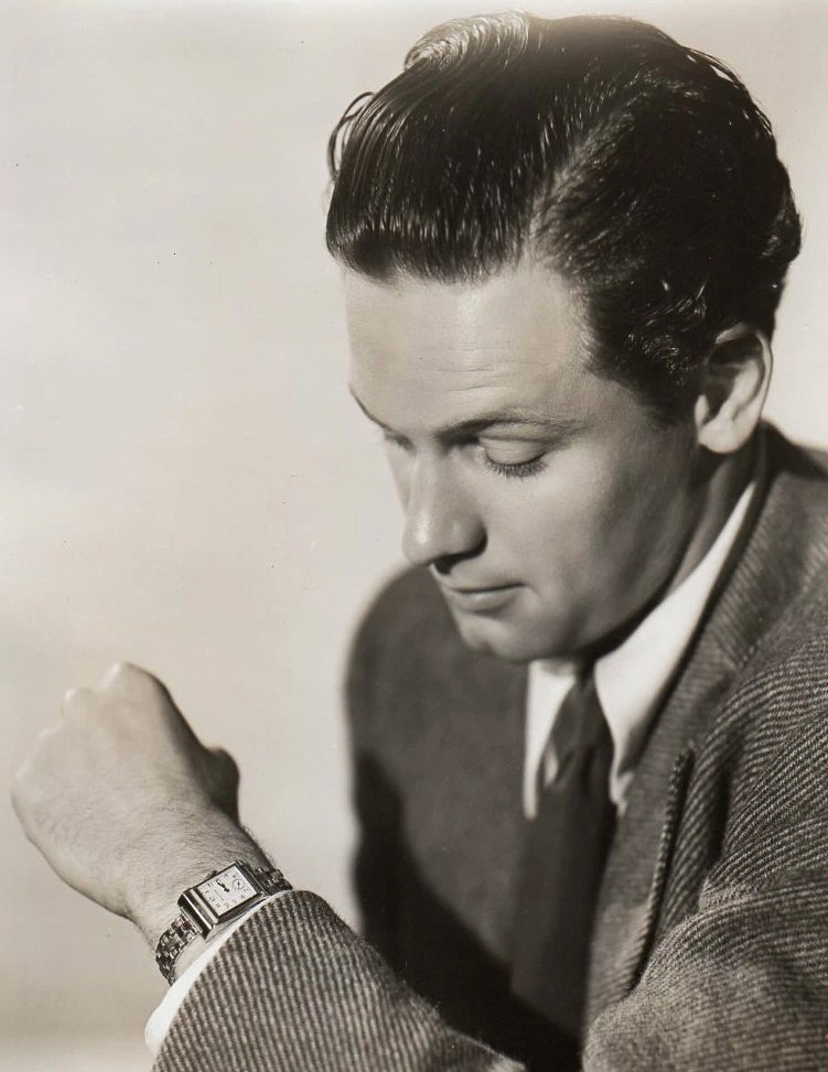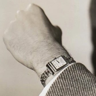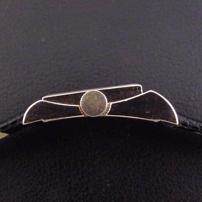 The true name of this "Rite-Angle" model was unknown until an advertisement was found by a Bulova collector which identified it as the "Golden Boy." This watch was worn by actor William Holden in the 1939 film "Golden Boy" and Bulova advertising featured Holden wearing the watch. It was priced at $42.50 and has a radical wedge-shaped case with an inclined dial which allowed for easier reading of the dial. Usually found in yellow, this rose version is rare. It is in excellent condition with just a few specks of brassing to the corners of the rectangular bezel. Caseback is excellent and unengraved, with only a few tiny specks of brassing in the corners. Case measures 34mm long and 22mm wide. Original two-tone rose dial is excellent. Has new glass crystal. The watch is powered by its correct 17-jewel Bulova grade 8AE manual wind movement, just serviced and running strong.