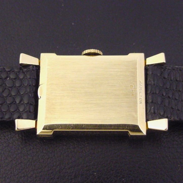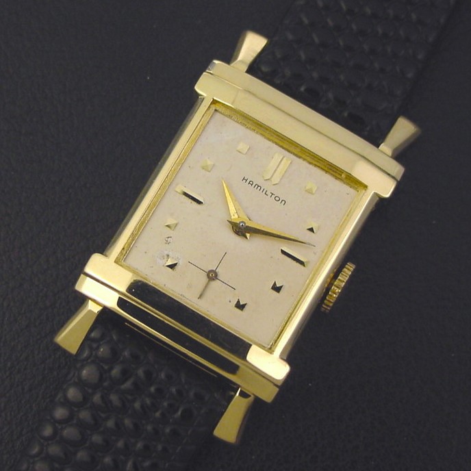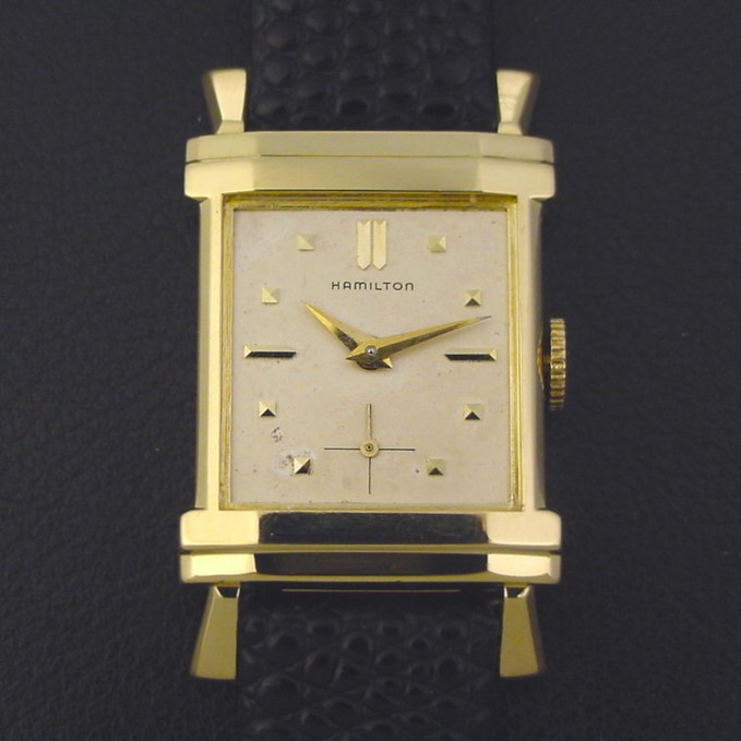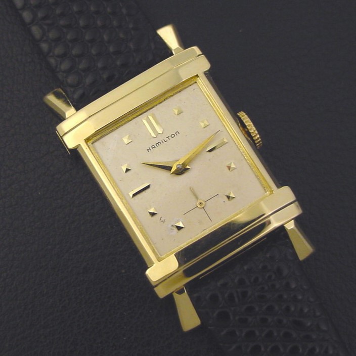 Scarce Hamilton "Berkshire" men's Retro Modern design wristwatch in solid 14K yellow gold, circa 1953.