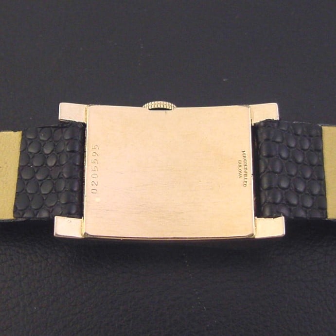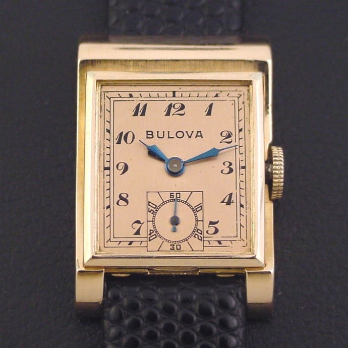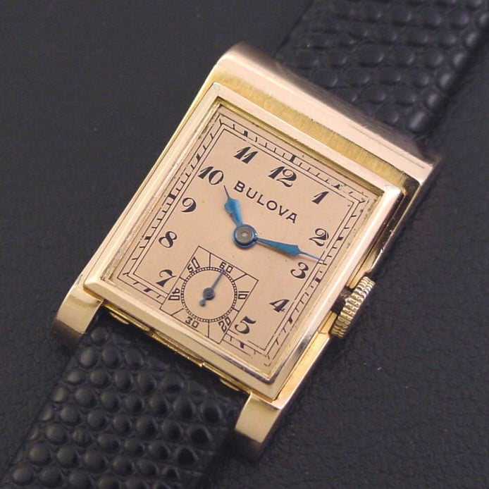 Rare Bulova "Rite-Angle Golden Boy" men's Art Deco design wristwatch in 14K rose gold fill, circa 1940.