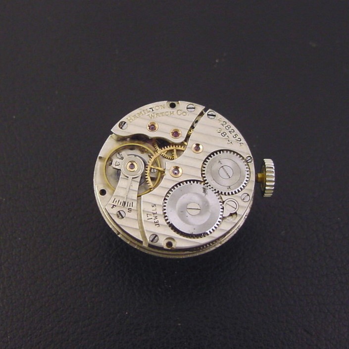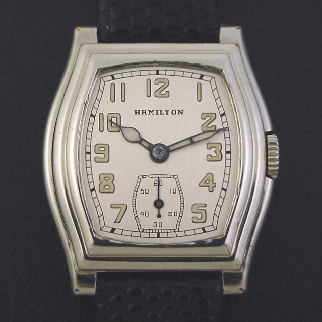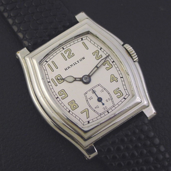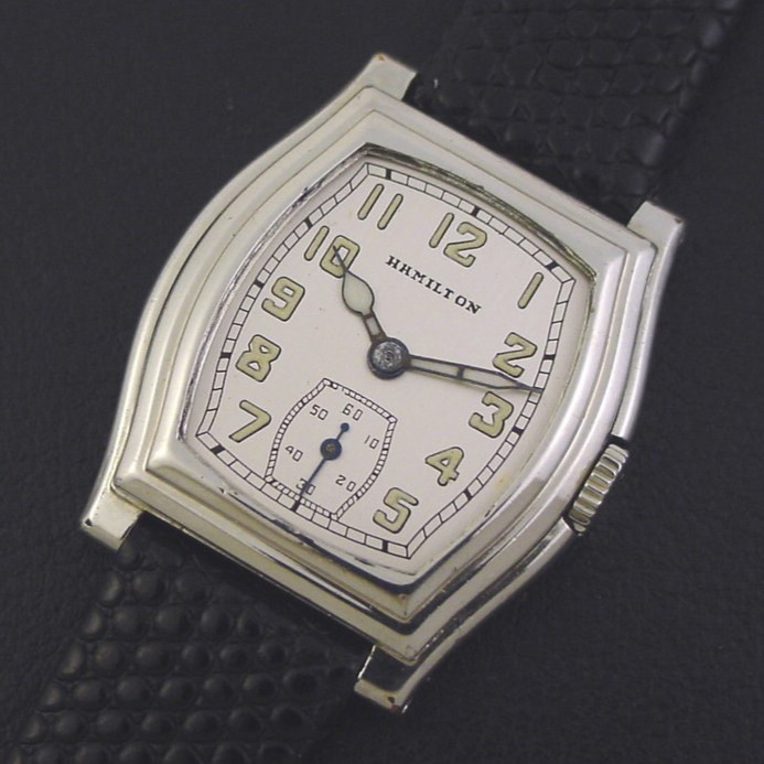 The “Whitney” has a very striking flared and stepped case... its dramatic design and low production make it among the most desirable of the early 1930s Hamilton models. It is a scarce model, with only 4,136 produced in white. It was priced to consumers at $55.00 in 1933. This example is in excellent condition with only a few specks of brassing to the bezel corners and lug tips. Caseback is excellent and unengraved, with a few tiny wear spots in the corners and a few tiny dings. The case measures 36mm long and 30mm wide. Has new glass crystal. Refinished dial is superb. This watch is powered by its correct 17-jewel Hamilton grade 987-F manual wind movement, just serviced and running strong. Has original flat winding crown.