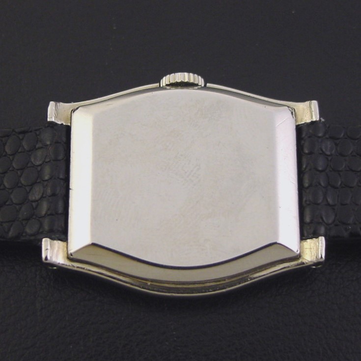 Scarce Hamilton “Whitney” men’s Streamline Moderne design wristwatch in 14K white gold fill, circa 1931.