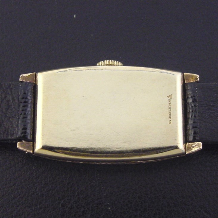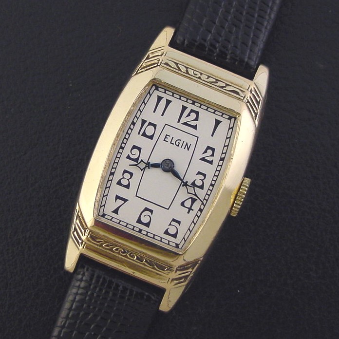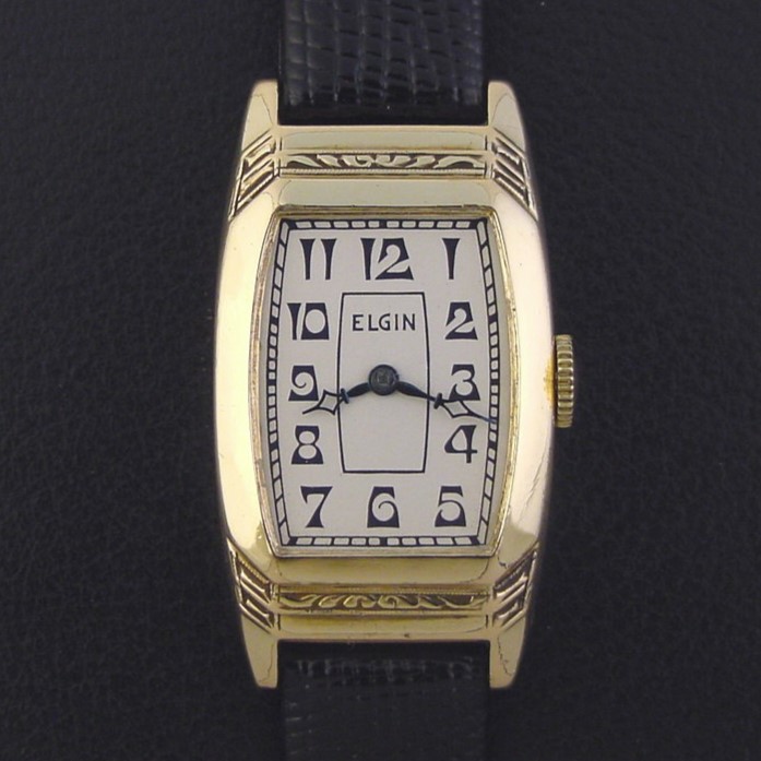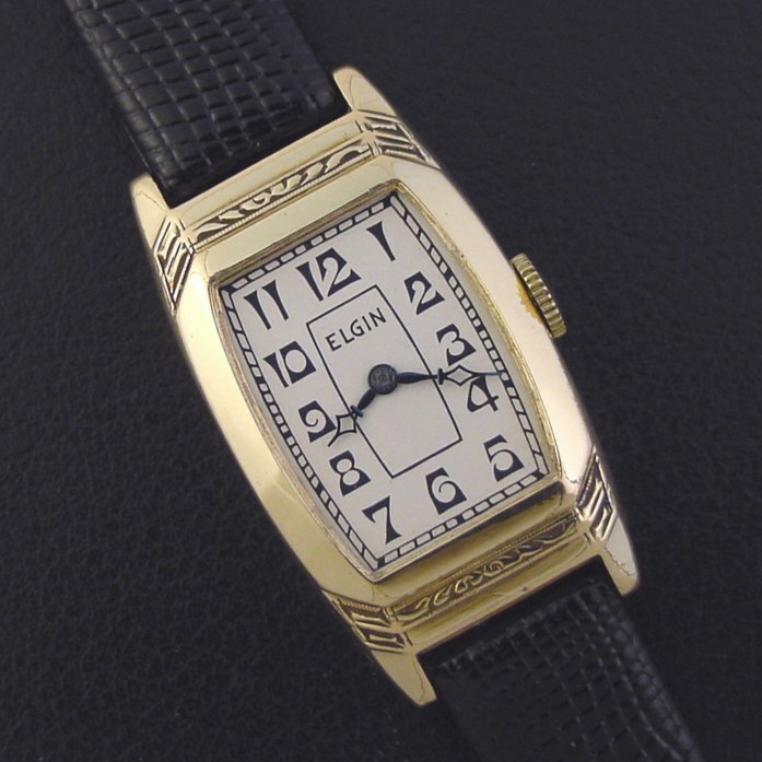Elgin "Jobber Stepped Deco Case" men's Art Deco design wristwatch in 10K yellow rolled gold plate, circa 1936.