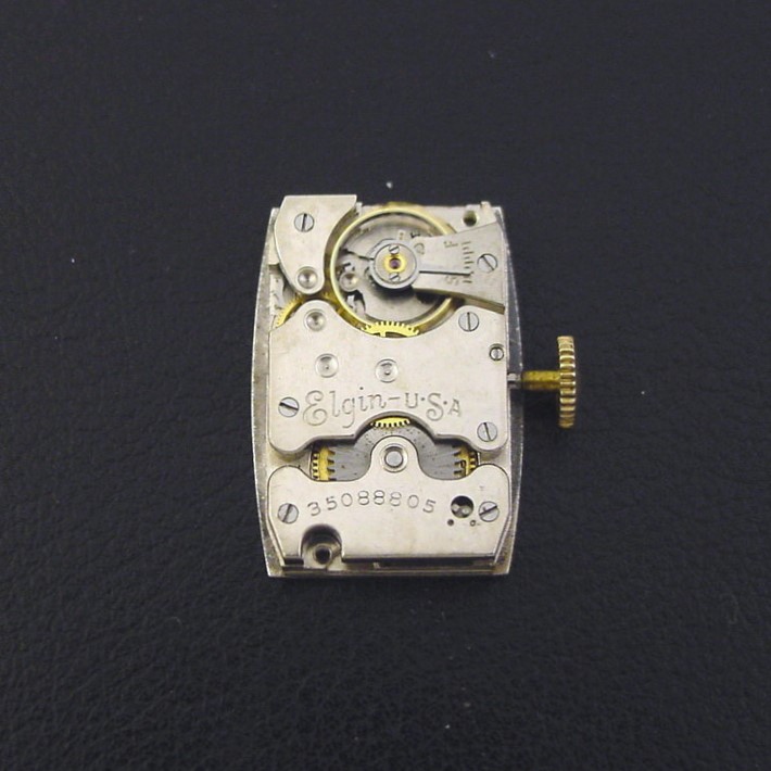 The smaller-sized jobber-made case is one of the many designs offered by mail-order jewelers to re-purpose Elgin movements. It houses an Elgin 18/0-size movement with an inlaid enamel dial with fantastic Egyptian Revival style numerals. It is excellent condition with some light overall brassing to the highpoints of the bezel. Caseback is excellent and unengraved, with a thin ling of brassing along one edge. The case measures 38mm long and 21mm wide. Original inlaid enamel is excellent. Has new glass crystal. The watch is powered by a 7-jewel Elgin grade 488 manual wind movement, just serviced and running strong. The watch has a 1/2-inch lug width.