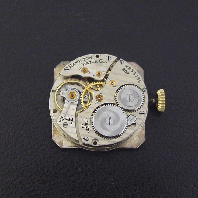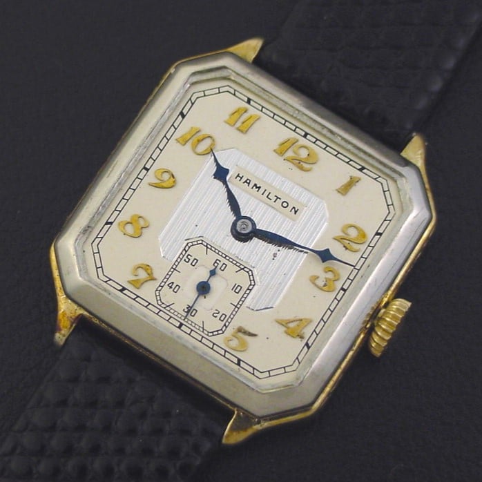 This is the second version of the "Square" model and was introduced in 1927. It has a case made by Fahys with a wide center casebody. The gold alloy used in the center casebody often takes a greenish color, giving the case a striking two-tone appearance. This example has a rare two-tone pinstripe dial with solid 18K gold numerals sourced by Hamilton from Fluckiger of Switzerland. In this configuration, this watch was priced at $93.00 in 1928. It is in excellent condition showing only very light wear. Caseback is excellent, with an Art Deco design monogram. The case measures 35mm long and 29mm wide. Refinished dial is excellent, with some light marks. Has new glass crystal. The watch is powered by its correct 17-jewel Hamilton grade 987 manual wind movement, just serviced and running strong.
