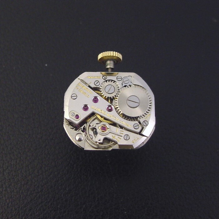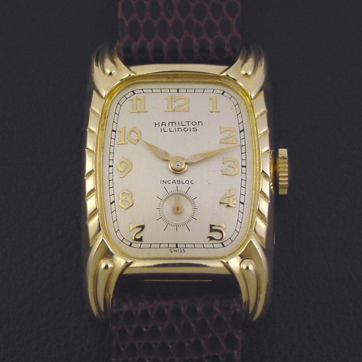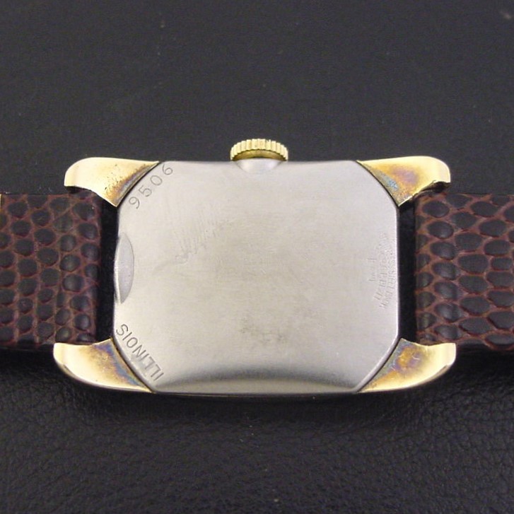 The “Debonair A" has an ornately embossed case and was priced at $39.75 in 1955. This is the first example of this scarce model I have offered in many years. This example is in crisp, excellent condition with no brassing. Caseback is superb and unengraved, with all of its factory brushed finish. Case measures 37mm long and 24mm wide. Original dial is superb, has embossed gold numerals. Original domed glass crystal is superb. The watch is powered by its correct 17-jewel Illinois manual wind movement, just serviced and running strong.