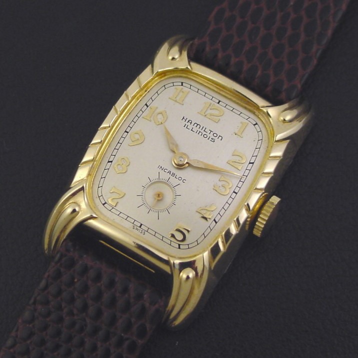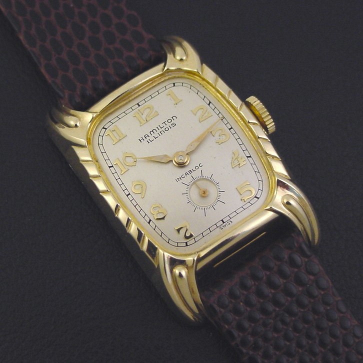 Scarce Hamilton Illinois “Debonair A” men’s Retro Modern design wristwatch in 10K yellow rolled gold plate and steel, circa 1955.