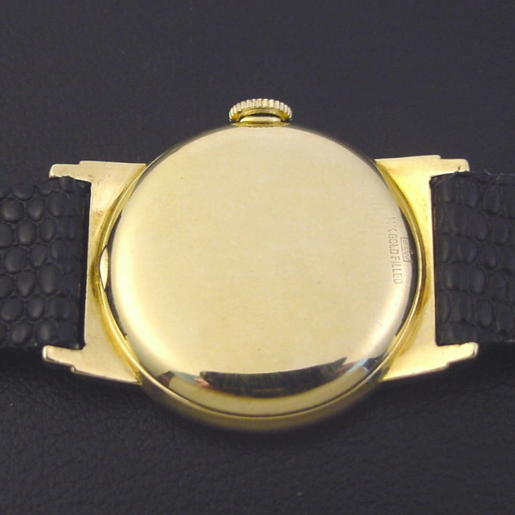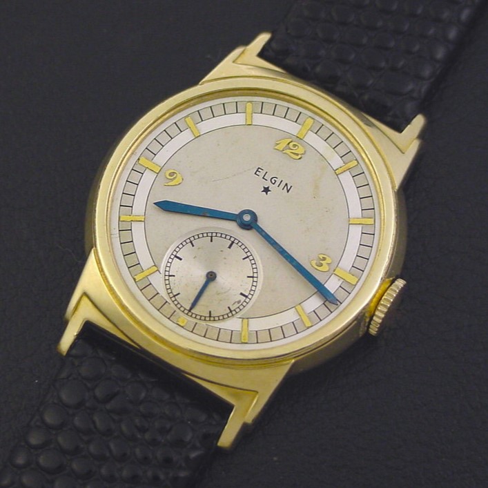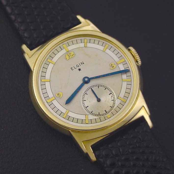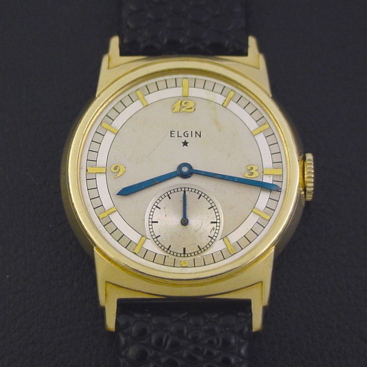 Scarce Elgin “Crusader 1837” men’s Art Deco design wristwatch in 14K yellow gold fill, circa 1937.